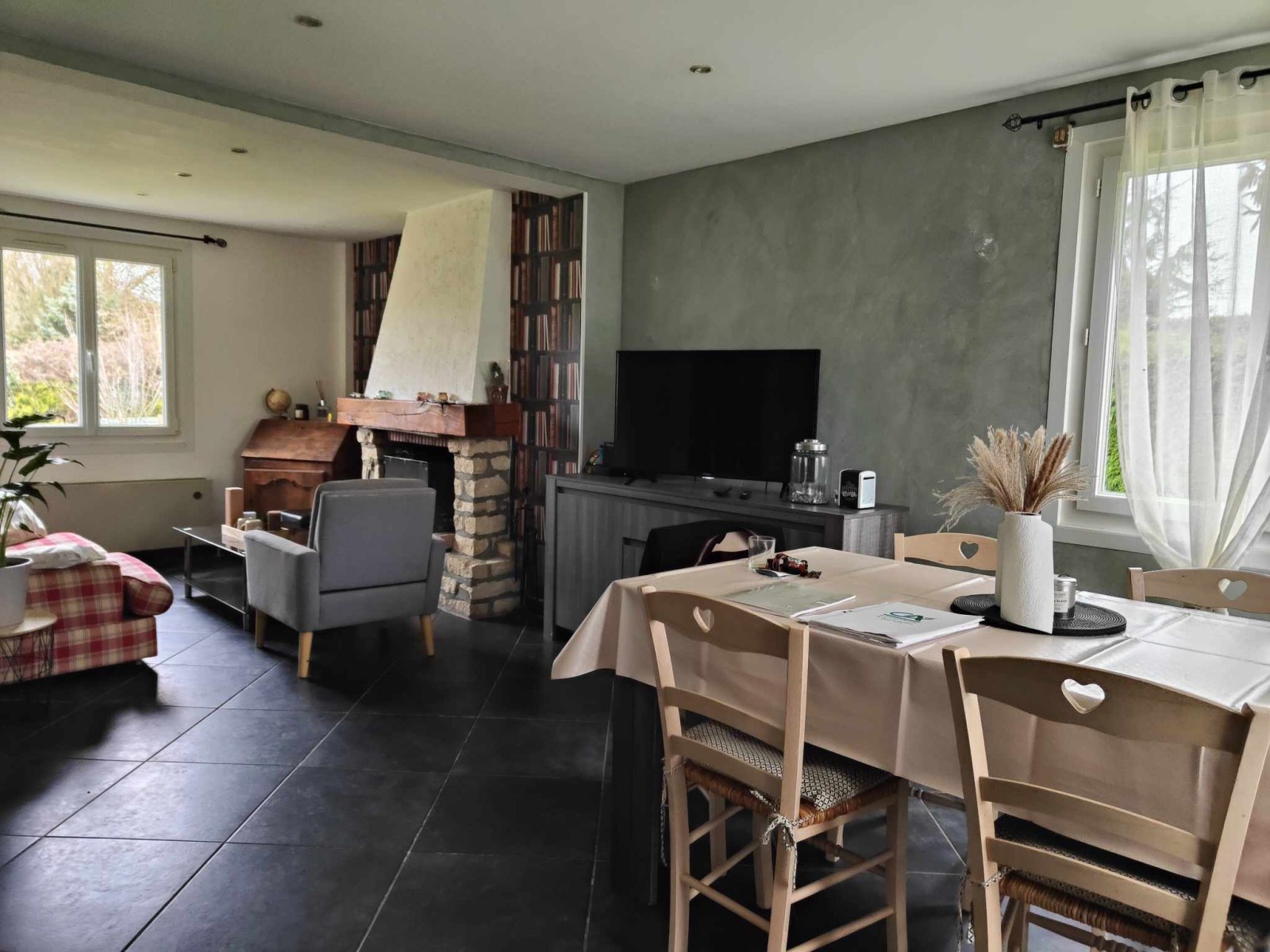 Il se compose au rez de chaussée d'un salon séjour agrémenté d'une belle cheminée, d'une cuisine ouverte, d'une chambre et salle de douche permettant une vie de plain pied